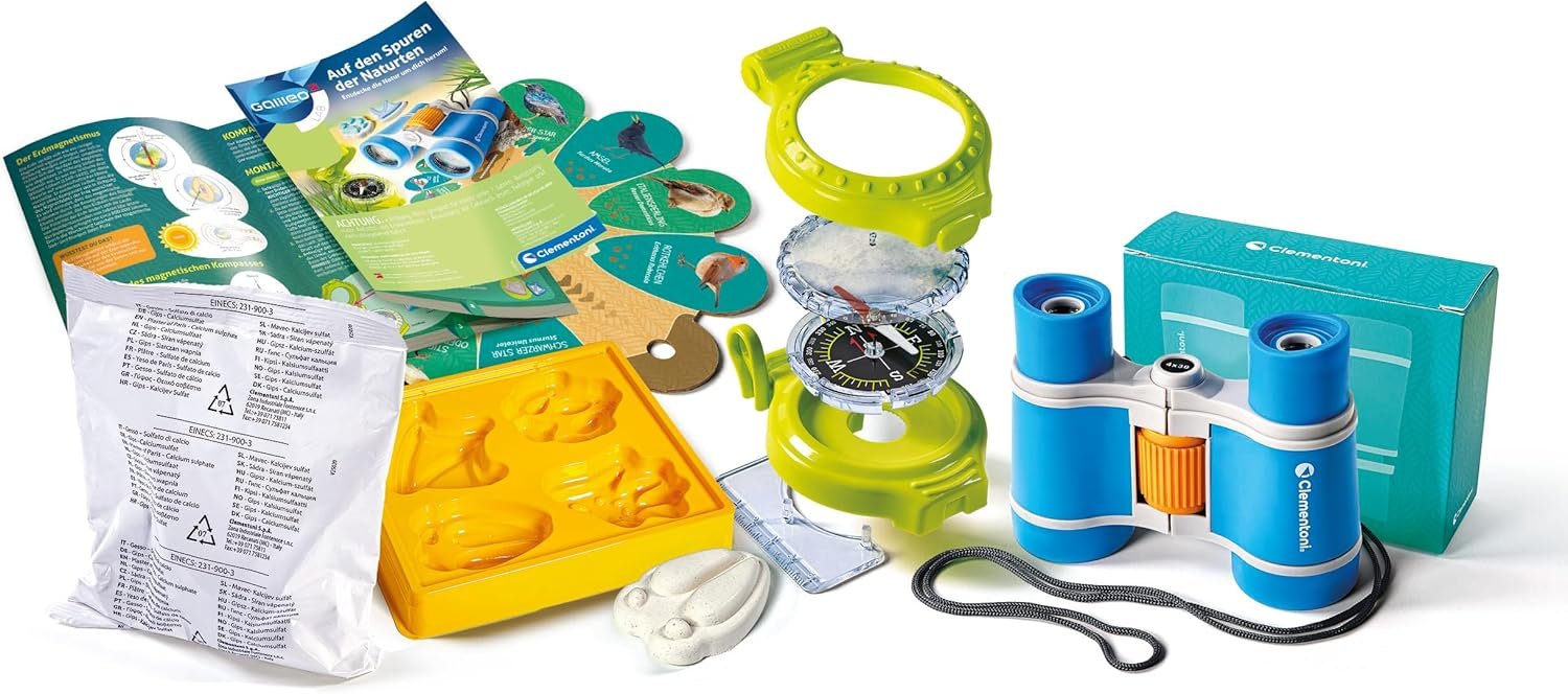 La emocionante caja de experimentos para niños: Con el juego «En los pasos de la naturaleza», tu hijo se convertirá en naturalista y aprenderá una nueva visión del hábitat de los animales. Con los prismáticos, tu hijo puede observar aves o explorar las pequeñas alas de una mariquita con la lupa antes de que la brújula indique el camino seguro a casa. El set incluye juguetes como brújula, lupa de vaso, prismáticos, así como mapas informativos y un cartel.