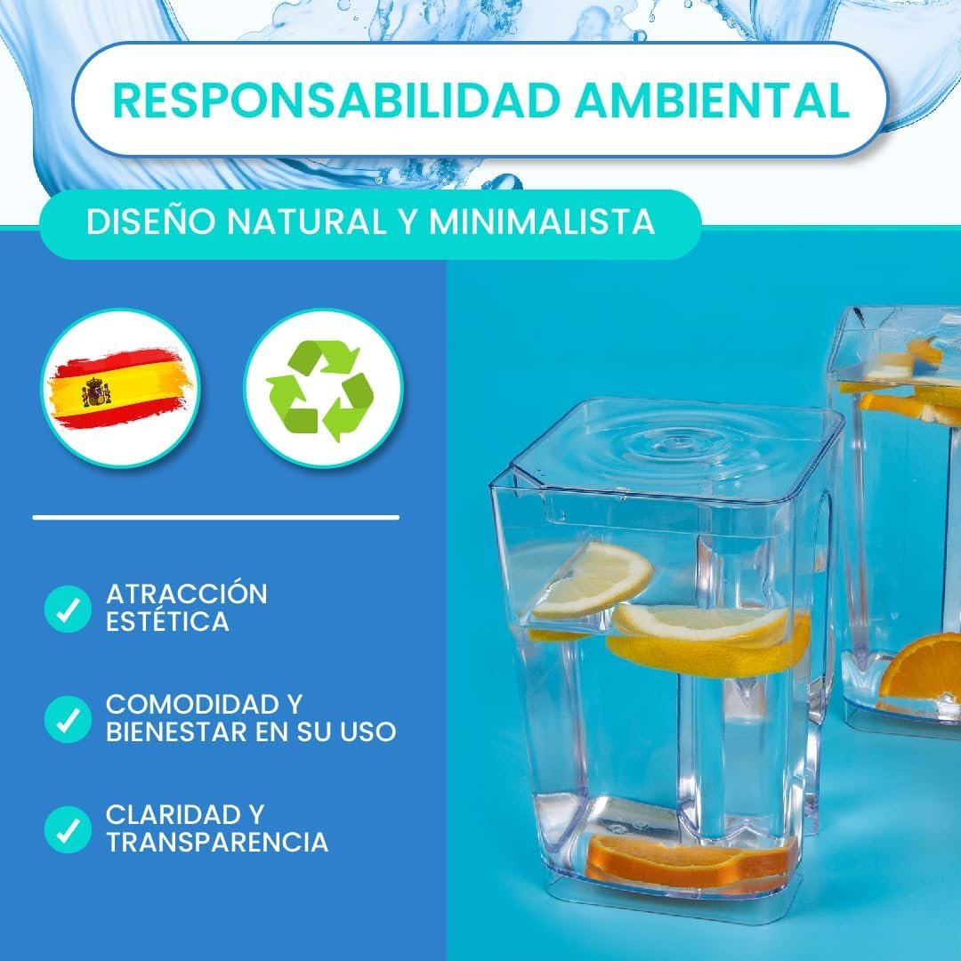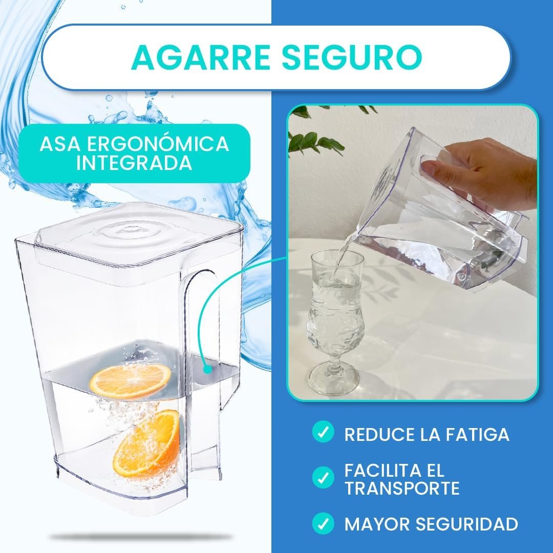 Con una capacidad de 1.4 y 1.8 litros, estas jarras te proporcionan una generosa cantidad de agua, ideal para satisfacer las necesidades de toda la familia o mantener hidratados a tus invitados durante una reunión.