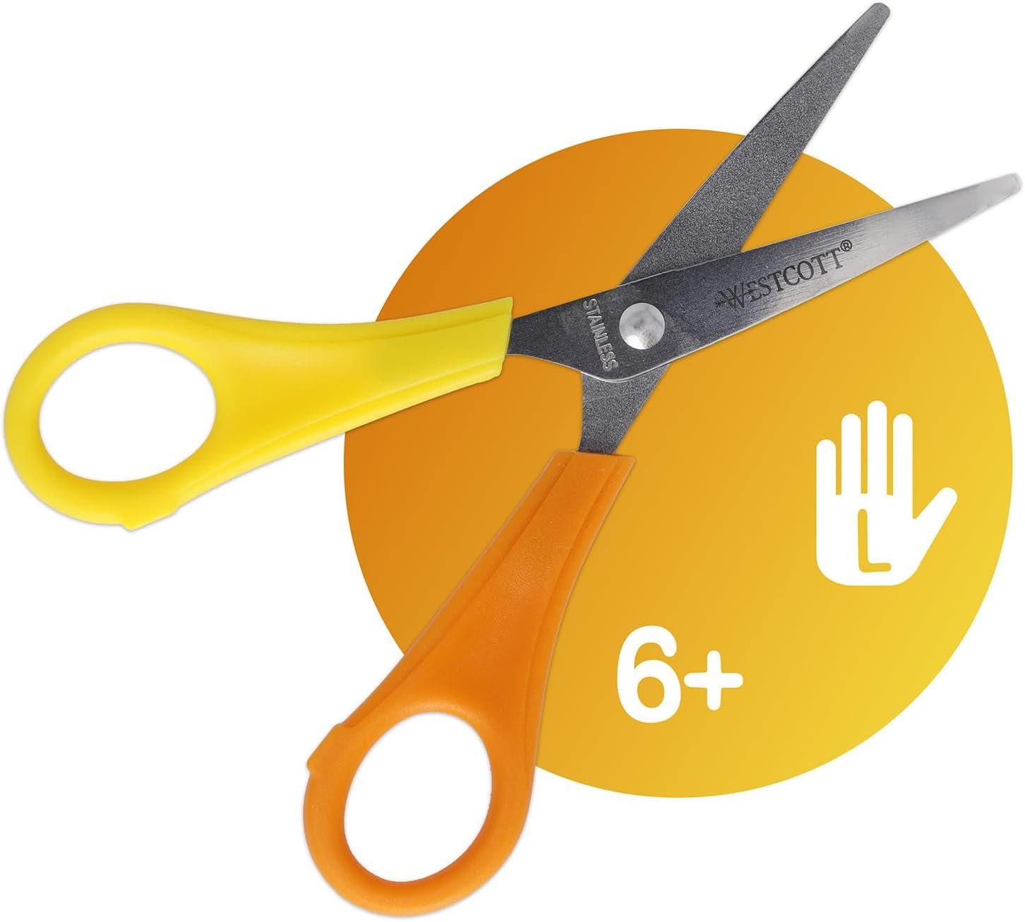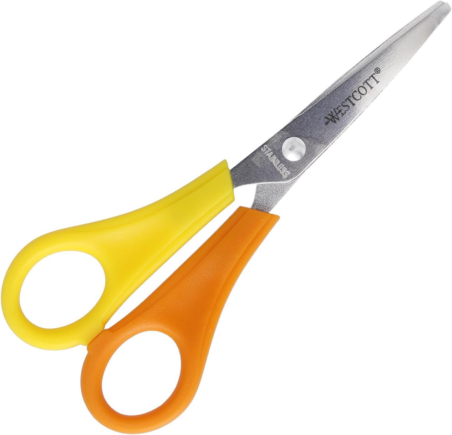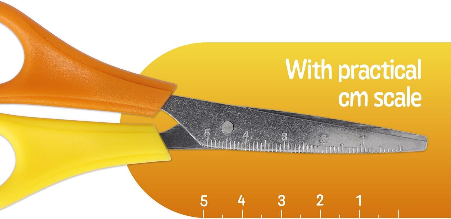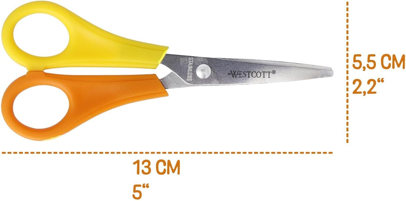 Westcott E-21596 00 – Tijeras para niños, diseño de bruja zurda, escala en cm, punta puntiaguda, 13 cm, rojo/amarillo, el embalaje puede variar